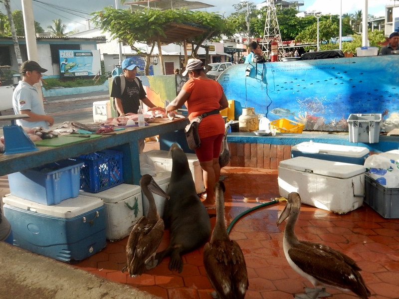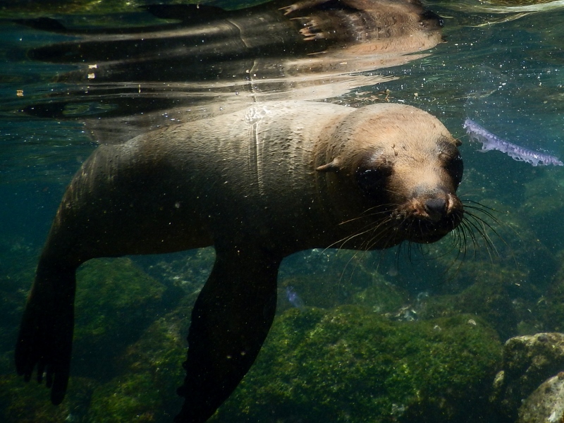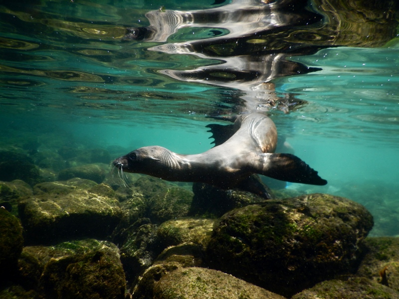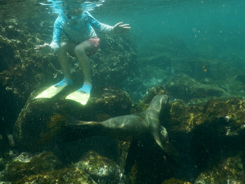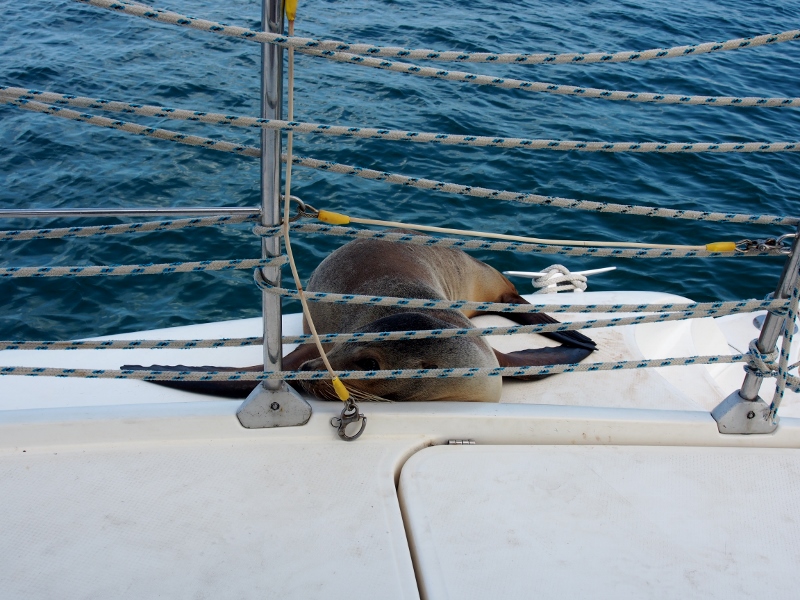 It’s not only the birds that are friendly:we spot several turtles and playful sealions folow the wake of the boat as we approach. Indeed, the sealions seem very friendly: when we reach the anchorage we spot them perched on the stern of the yacht anchored in front of us, and as we sit there watching we see it clamber into the cockpit…
