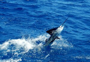 After breakfast, Steve spots a huge dark brown shark just off the stern, and later on when we get a strike on the fishing line and see a big dark shape we reckon that a shark is following our catch. But it turns out that the dark shape IS our catch – a huge white marlin! We are reluctant to struggle with a fish this size only to throw half the meat away when it goes bad, so we decide to let it go, only we’re not quite sure how to get the hook out of its mouth. Steve tries to tire it out and David positions himself on the back steps, hoping to catch a hold of its bill and yank out the hook. But it looks too big for us to try to manhandle it, and in the end we cut the line, hoping that the hook won’t impair this beautiful giant for long.