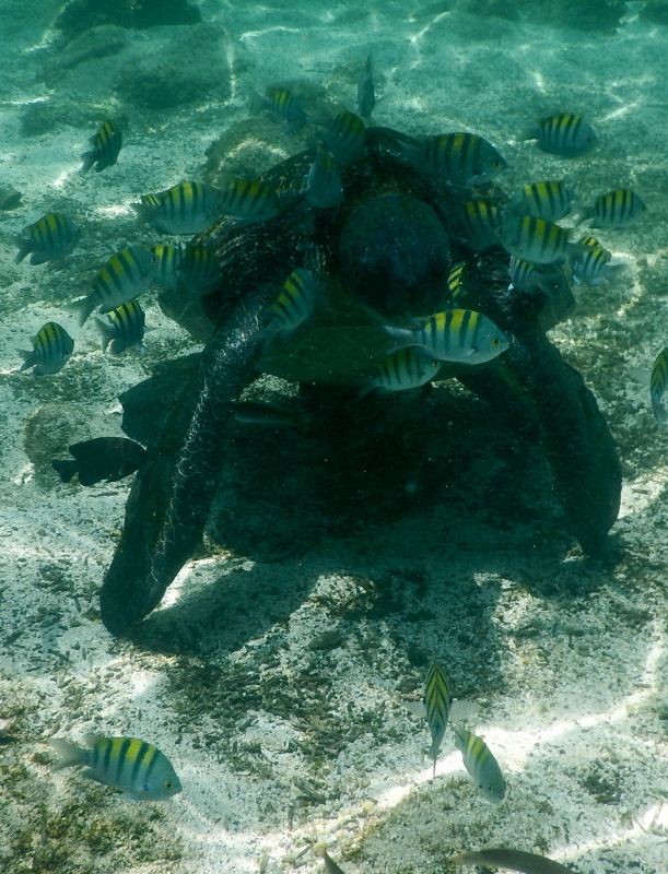 Later on Sarah and Steve spot a huge brown turtle from the trampoline, swimming straight under the center of the boat and coming up in the wake behind. It is hard to know what species, but we reckon maybe it is a large hawksbill.