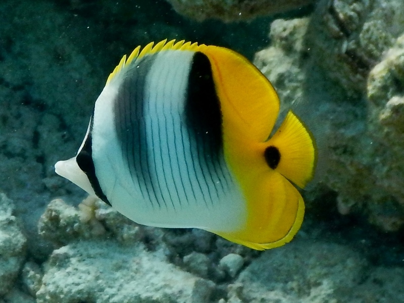 Hanging out with the surgeons are the delicate Moorish Idols, a plane shaped fish with a long dorsal fin filament trailing through the water behind them as their brightly striped yellow and black triangular shapes disappear after their short, pointy noses. They are similar in shape to the quick butterfly fishes that dart in and out of coral crevices, showing off their shimmering yellowy stripes and finely spiked dorsal fins. They are incredibly flat, only displaying a thin stripe with two bulging eyes when viewed front on, magically changing into rounded yellow-white discs as they turn side on.