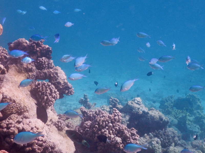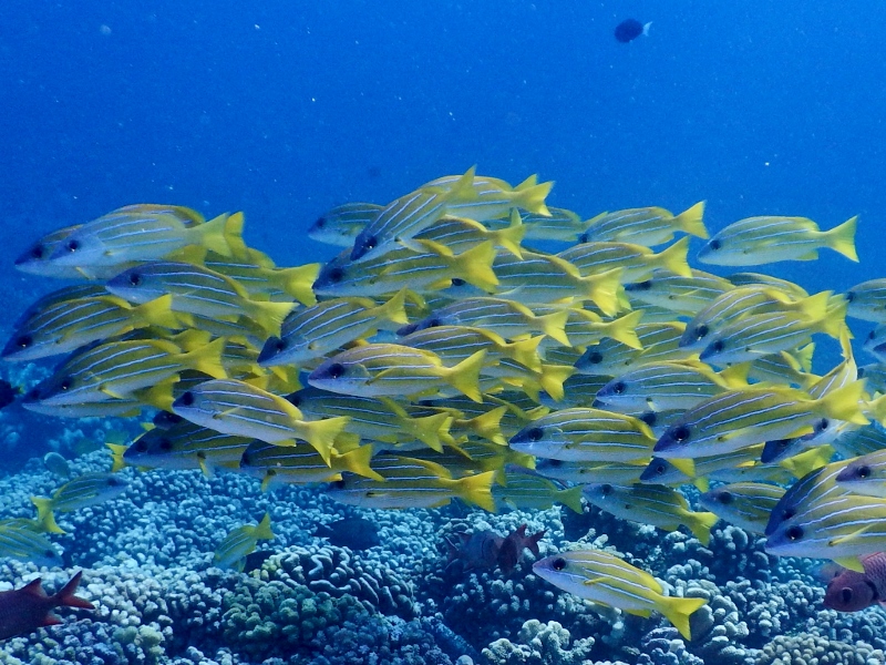 A bit further down in the water column are loose groups of the crazy unicorn fish which often hover below the dinghy. Here in Tahanea the bignose unicornfish flock to our side as soon as we stop the boat, hovering in our shadow like a group of teenagers in a mall after closing hours, waiting for something to happen. They are amazing fish which can change colour rapidly, from a dark browny black to a light blue complete with lemony white edges, their tail spines streaming beautifully behind them. The beautiful humpback snapper also gather densely below any structure they can find.