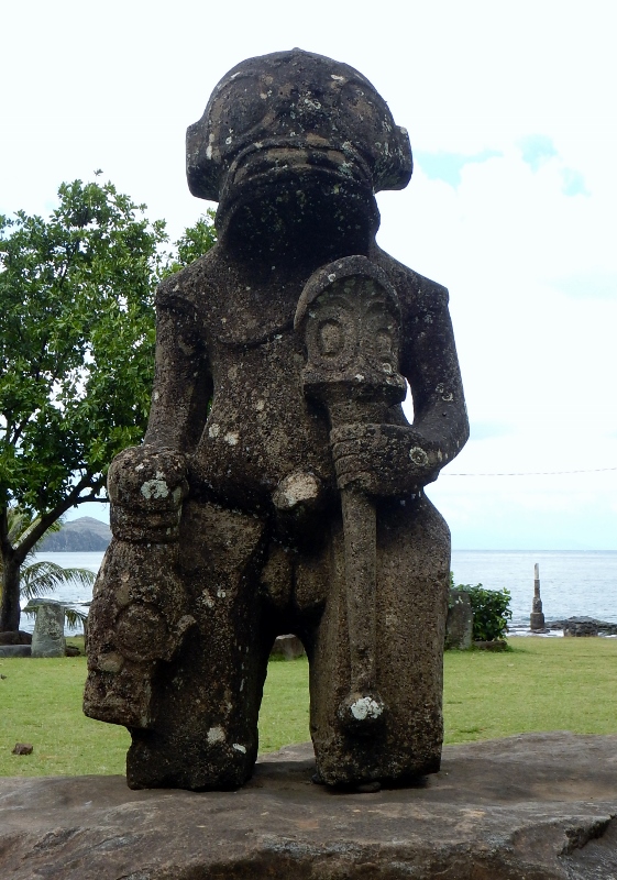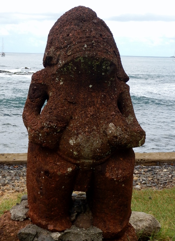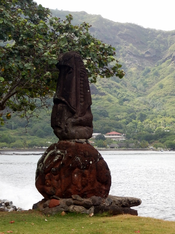 The main town, Taiohae is beautifully set in a large sheltered bay lined with steep, dark green hills plummeting down onto the narrow coastal strip that is the town. As usual old has been built on new, with large tiki lining the beach at intervals behind the smart rock revetment that keeps erosion at bay, a beautifully flower-filled graveyard poking out above the ancient monuments. The town church is situated on a paepae, an old rock foundation on which the me’ae (temples) used to be – it was commonplace for the missionaries to appropriate old sites of reverence and turn them into churches, a single effort to achieve the double goal of stamping out heathen worship and save on new foundations. Just behind the church is a huge banyan tree, in a pit under which live prisoners used to be kept until required back in the days of rampant cannibalism.