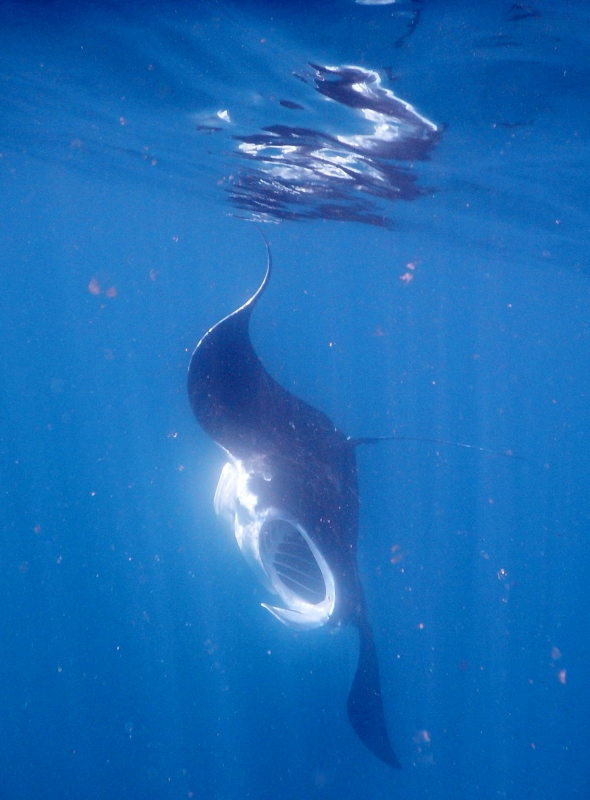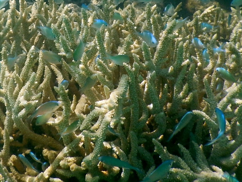 Just below the surface hover schools of silvery needlefish, slimlining against the background of the streaks of sunlight that blur the edges between air and water. Their sharp beaks are poised into the current as they sit, ready to pounce at passing plankton. Larger white fish hang just below the surface too, disguising themselves by blending in with the light streaming down from above.
