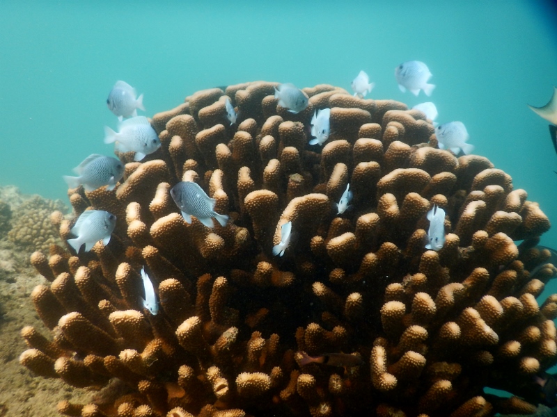 On the sand are huge numbers of pale yellowstripe goatfish, sitting completely still trying to blend in against the white sand, only darting away when we literally swim into them. Big roaming schools of large parrotfish swim by, systematically chewing away at the coral rubble, discharging huge amounts of sandy poop. Apparently much of the sand in the tropics is the result of the digestive processes of parrotfish, a fact easy to believe when you see the clouds of poop discharged by these large fish. The parrotfish have amazing beaks, sharp and pointy and incredibly efficient at cutting coral, and we are happy they are herbivorous. With their bright colours (ranging from brownish red and orange to the common blue green, fading over bright pink to a dusty grey white) and fast beating pectoral (side) fins they do look very much like parrots of a grazing, cow like in their herd attack on the coral meadow.