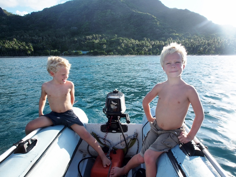 We stay a day by the main village and then head off to explore the many motu near the northern pass. Inspired by the locals, Val and David get into weaving using palm leaves and soon the boys are kitted out with skirts, belts, hats and armbands. Complete with a couple of stick on tattoos that Val brought they pose proudly for photos, pale Polynesian warriors wearing spiky sunhats, ready for anything.