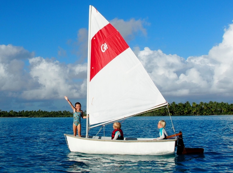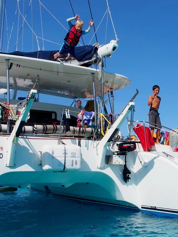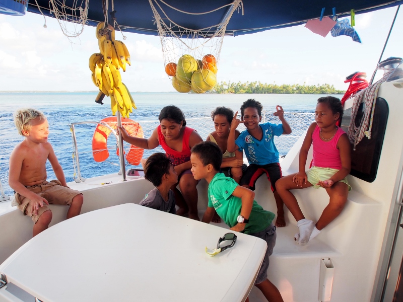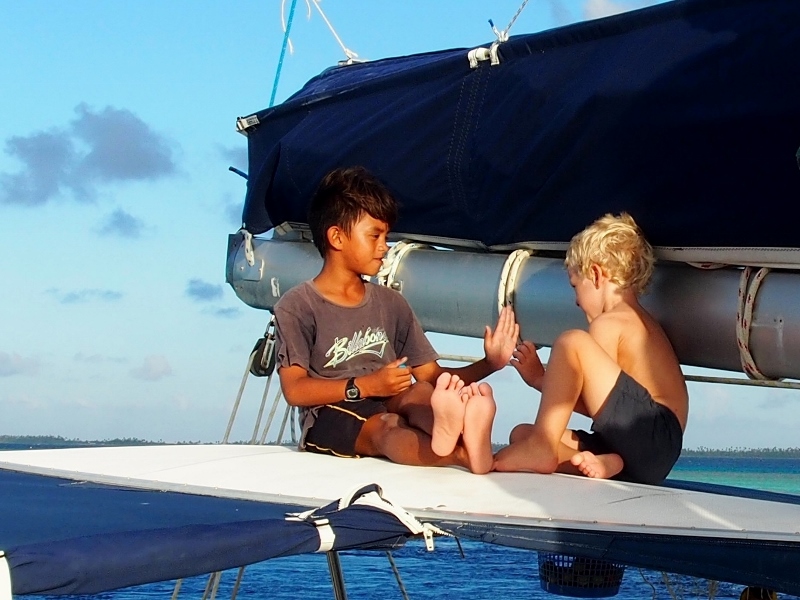 It is great to meet up with the Chris, Heather and the kids of the Family Circus again and Matias and Lukas are stoked to play with their youngest girls. They spend hours throwing sand on the beach, wading in the sea-cucumber studded waters, snorkelling the reef and jumping into the water from the rooftop of the Circus. Chris tows them around in the Circus kayak and after a quick sailing lesson Matias, Lukie and Alina inadvertently take off in a sailing dinghy on their own which they manage to sail back to the boat from the shore just fine.