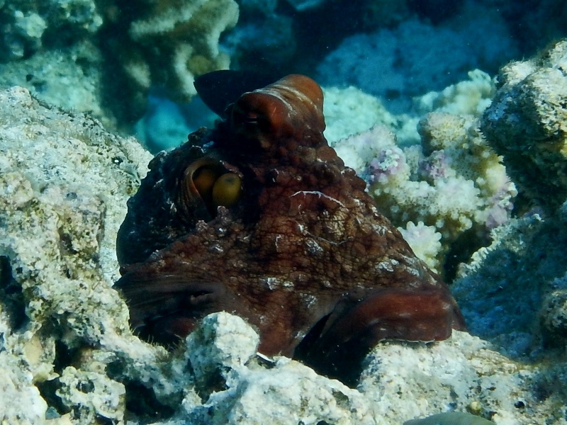 Dark fat-lipped groupers poke their heads out of coral caves, the large camouflage groupers swimming aggressively up as we approach, trying to chase us off their patch. Dark peacock groupers gamely change colour as they swim from dark coral to light sand, alternating between brown with blue fin tips on reef to lightly dotted beige over sand. Huge eyes stare out at us from other caves, where dark guineafowl pufferfish are hiding.
