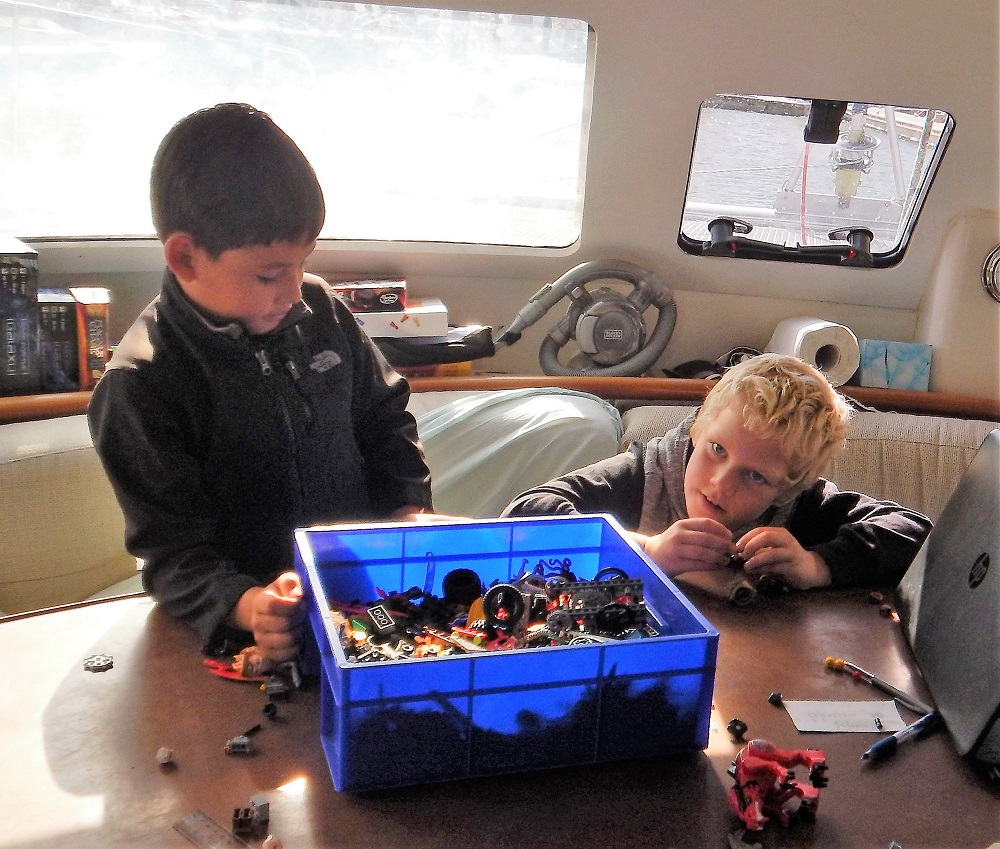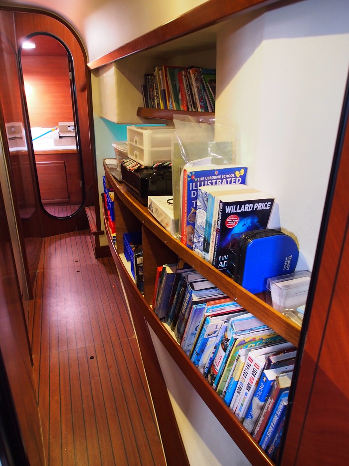 In addition to all the safety gear, David has been implementing a score of other improvements. New batteries replacing the old tired ones. A new 65-litre 12-volt freezer. A small washing machine installed in the front starboard head. A starboard shelving system where we can store all the home-schooling equipment, the books, and the lego. We call it ‘the library’.