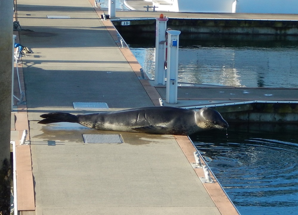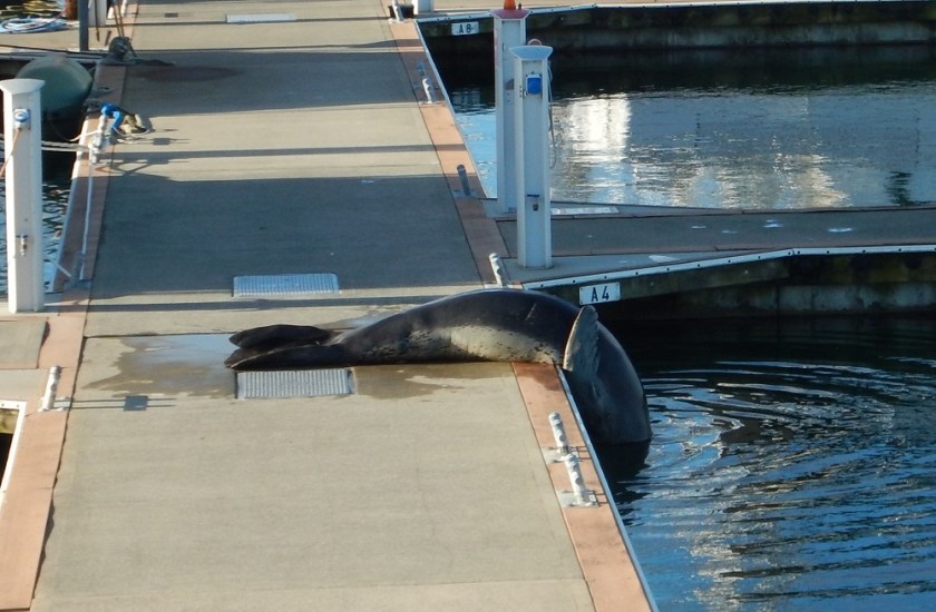 Finally, on this sunny afternoon on our way back from the beach we spot the seal. There she is, lying prostrate on pontoon ‘A’, sunning herself. She’s not quite the 12-foot reported giant; we estimate her to be more like 8 feet. But still a large animal. While we watch from a safe distance she rolls and sighs, grunts and puffs. Once she’s had enough of the sun she sticks her head into the water as if to scout the fish life, and then after a couple of minutes her body follows, slowly gliding into the dark water like a giant slug.