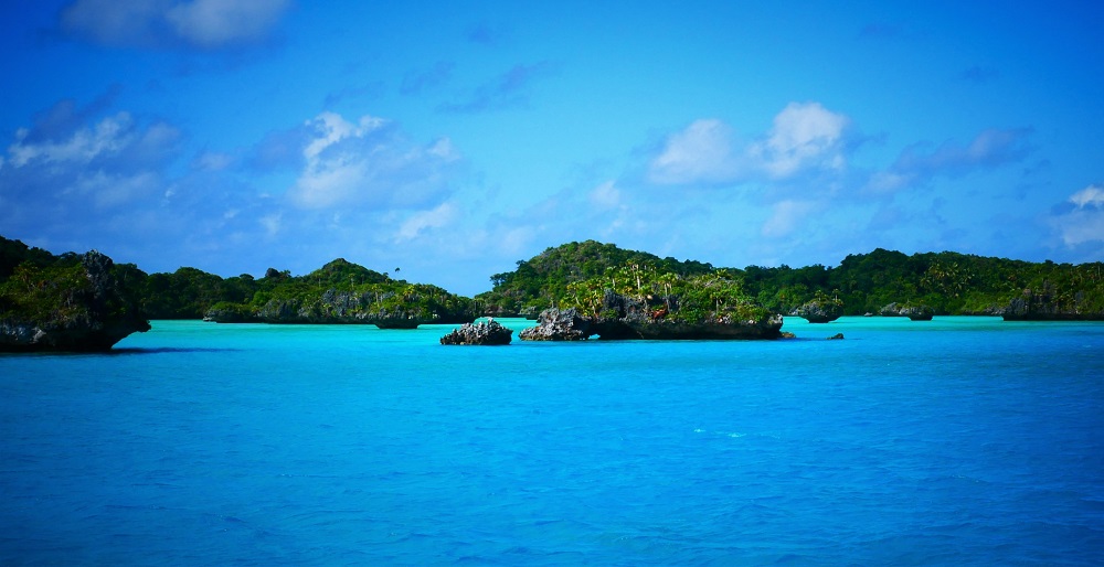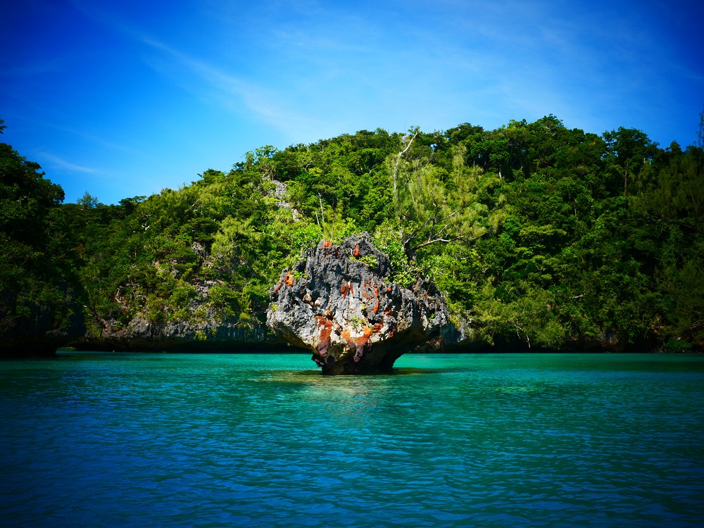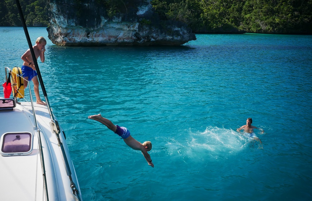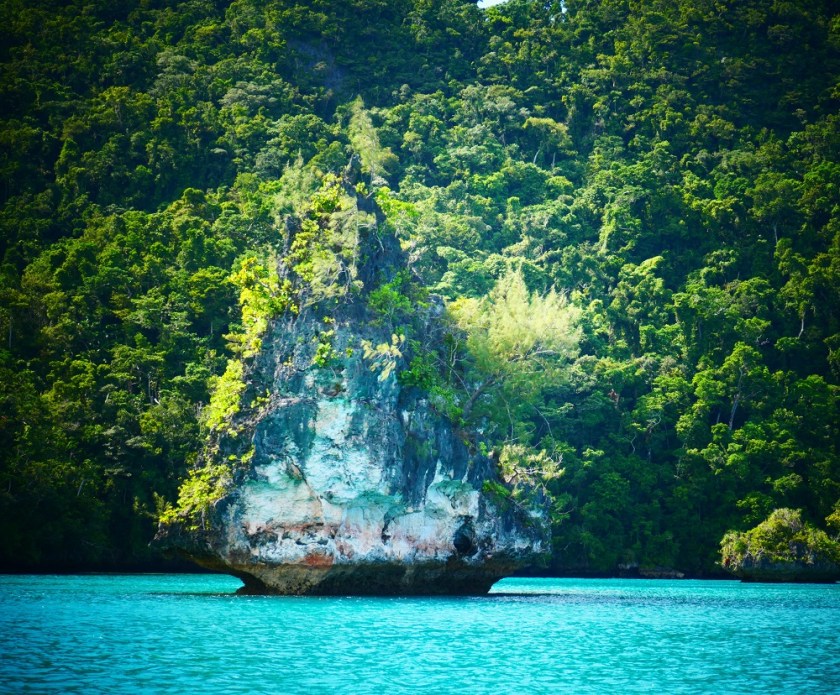 As the name suggests, the area is full of islands – uplifted limestone reef islets and larger, volcanic outcrops. It is spectacular scenery. Dramatic vertical rock faces surrounded by bush, overlooking crystal-clear bays, the water changing from deep green depths to aquamarine shallows. The imposing limestone walls and islands are dark grey, severe and full of jagged edges and sharp outcrops, the sort of landscape that will wreck ships, puncture inflatables, and cut your feet to shreds if you venture ashore.