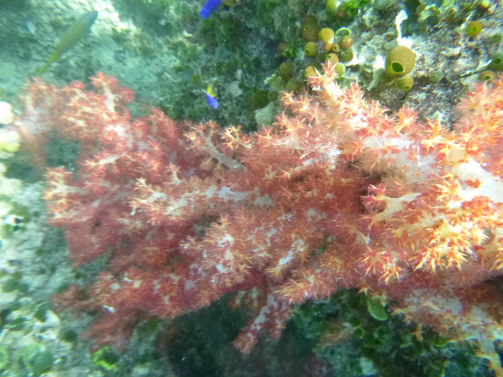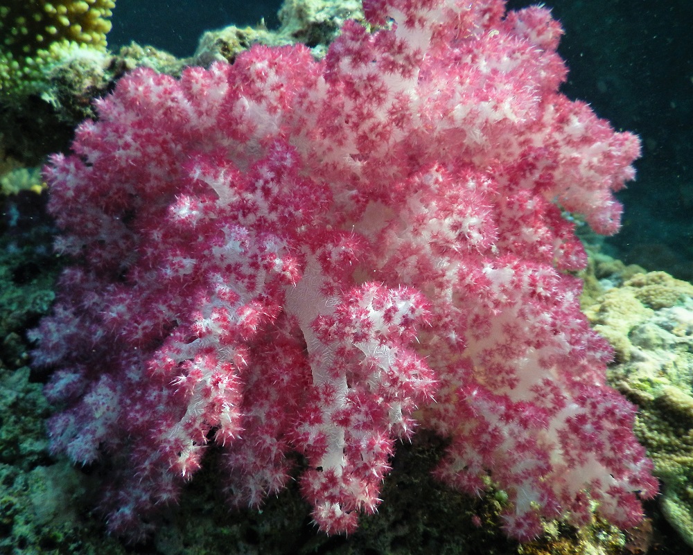 Weird soft pink coral.Crown of thorns eat coral.Mushroom coral.
