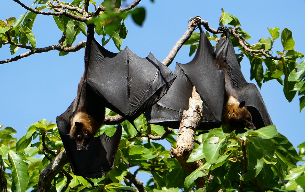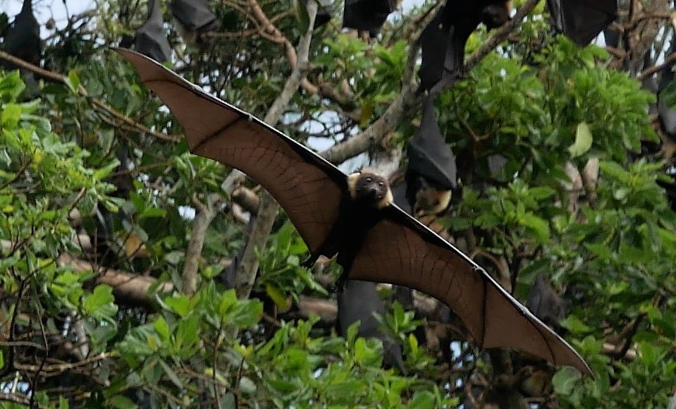 Wedged in between the mangrove roots, the dinghy cannot move, and we sit craning our necks just under the steep, forested hillside, taking in the sky as it comes alive with dark, menacing shapes. Never before have we been so close to so many large animals moving at once. It is like a huge colony of roosting birds all taking flight from the same tree, at the same time.