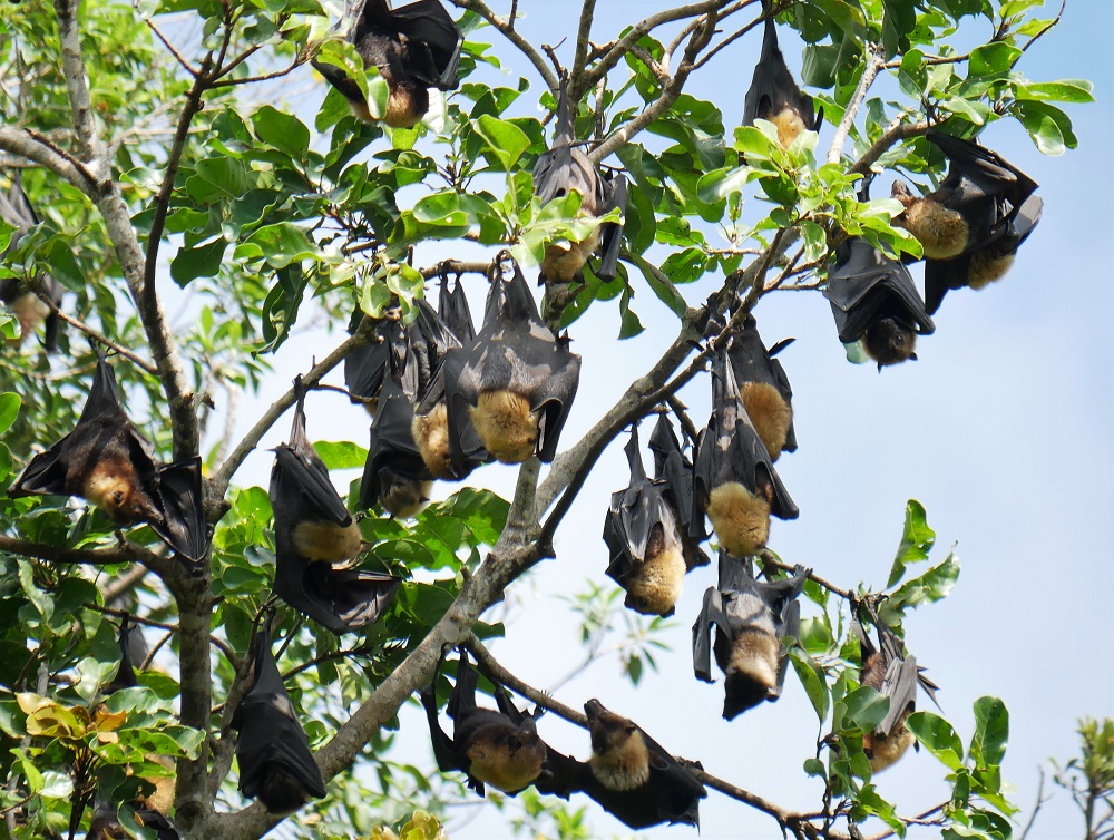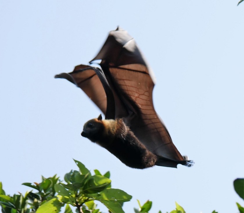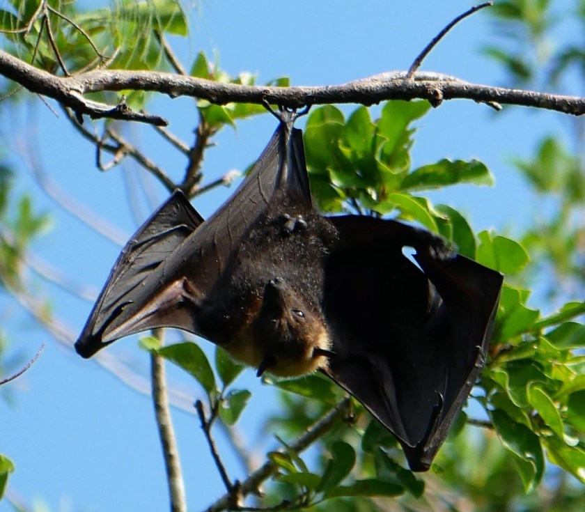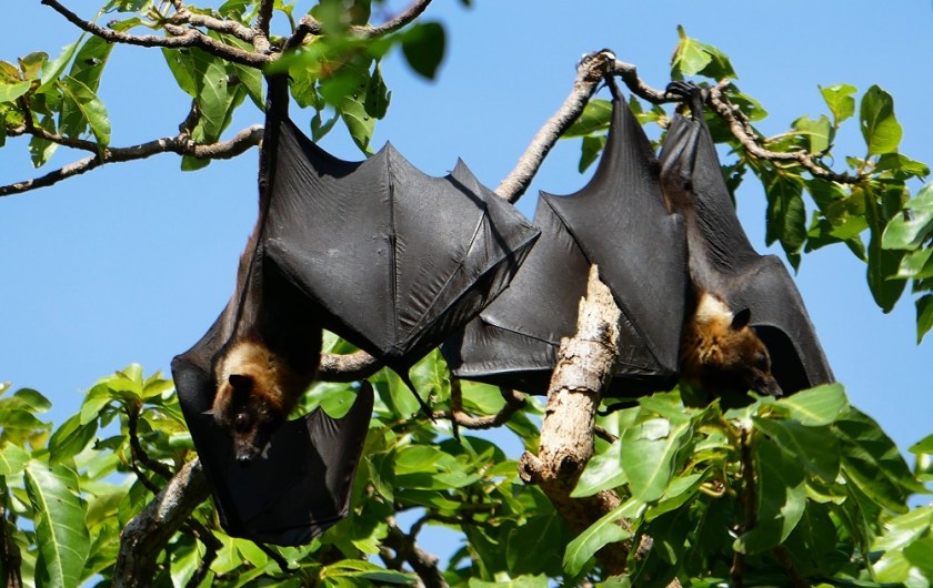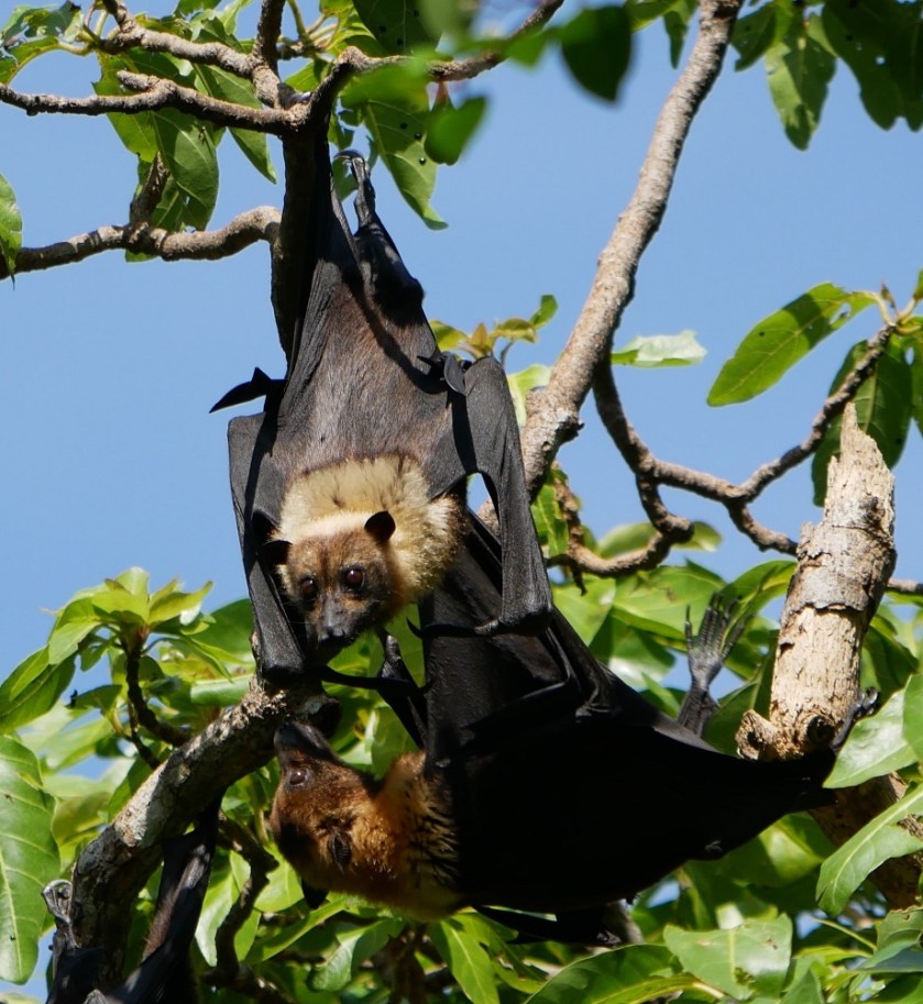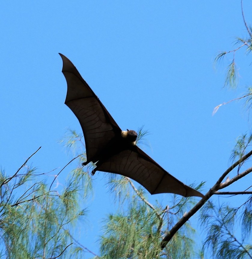 When we stay, they get more agitated and some take off like parachuting possums, strange furry fox faces and portly tummies attached to bird-like wings, tiny clawed spider feet sticking inelegantly out at back. Some have tears and holes in the wings through which we can see the sky behind. They circle and chatter and land on another branch, folding their wings, and clumsily climb through the trees using their feet, like giant grasshoppers navigating twigs and branches. Once in a suitable spot, they let themselves fall heavily, head down, their shiny black blanket wings tucked tightly around them.