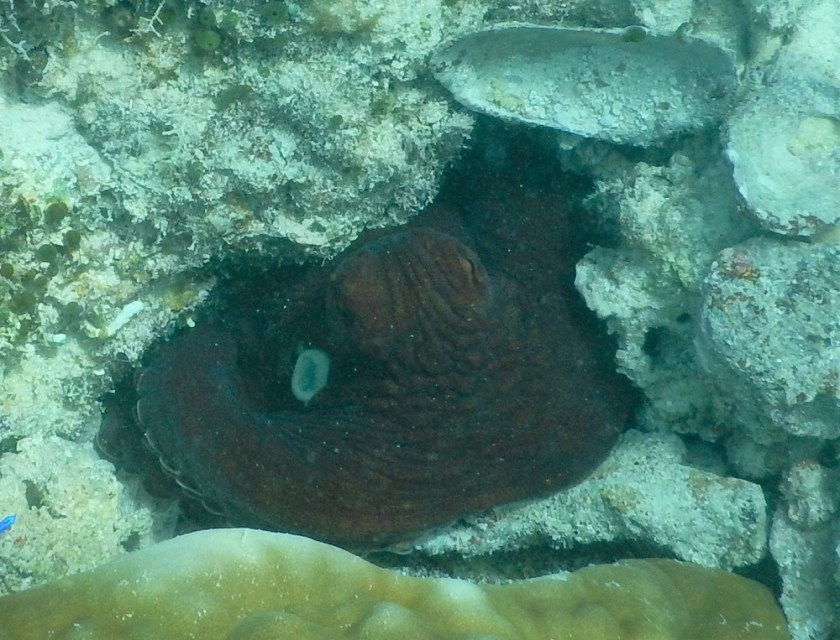 Kelt is the most camouflaging coolest octopus. He hides in a coral. When you come close he turns red-because he is angry that you are invading his house.