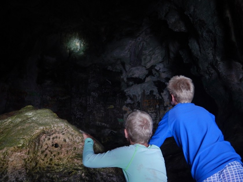 Inside a large, partially submerged cave we find microbats, who click and squeal as they echolocate in the darkness above us. Much smaller than the fruit bats they are difficult to make out and at first we think they are birds, but when we shine a torch we can make out the jagged edges of their wings.