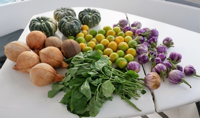 The following day we are presented with a plentiful bounty, freshly harvested. The price is a bit outrageous, but I really don’t care. The lady seems happy enough to sell them and we are desperate. Pumpkin, eggplant, lemons, spinach and coconuts. Enough to last us for weeks. We pay for the vegetables and donate extravagantly towards the church rebuild, leaving the village with everybody happy.