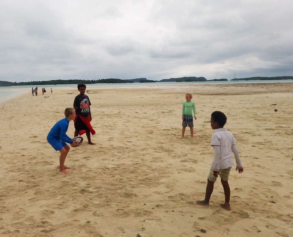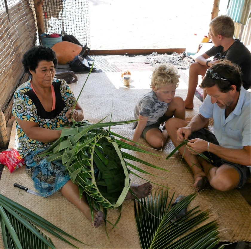 It is a great feast. The local village children all take part, and Matias and Lukie play endless rounds of soccer and rugby, tumble about in kayaks, throw frisbees and play tag, their blond heads disappearing in a cloud of black afros. The village men started the earth oven the night before, and the pig was put to roast with cassava and yam early in the morning. Yachties have been busy ferrying locals from the village to the sandspit since mid-morning, a 20-minute trip by boat. Once everyone has arrived, the Fijian matrons start weaving palm leaf mats for shade and to sit on, baskets to use for food preparation, and basket-like plates to eat from. Within half an hour a comfortable temporary settlement has been set up on the remote sandspit, and the men tend the oven while the ladies gossip and prepare food in the palm leaf baskets.