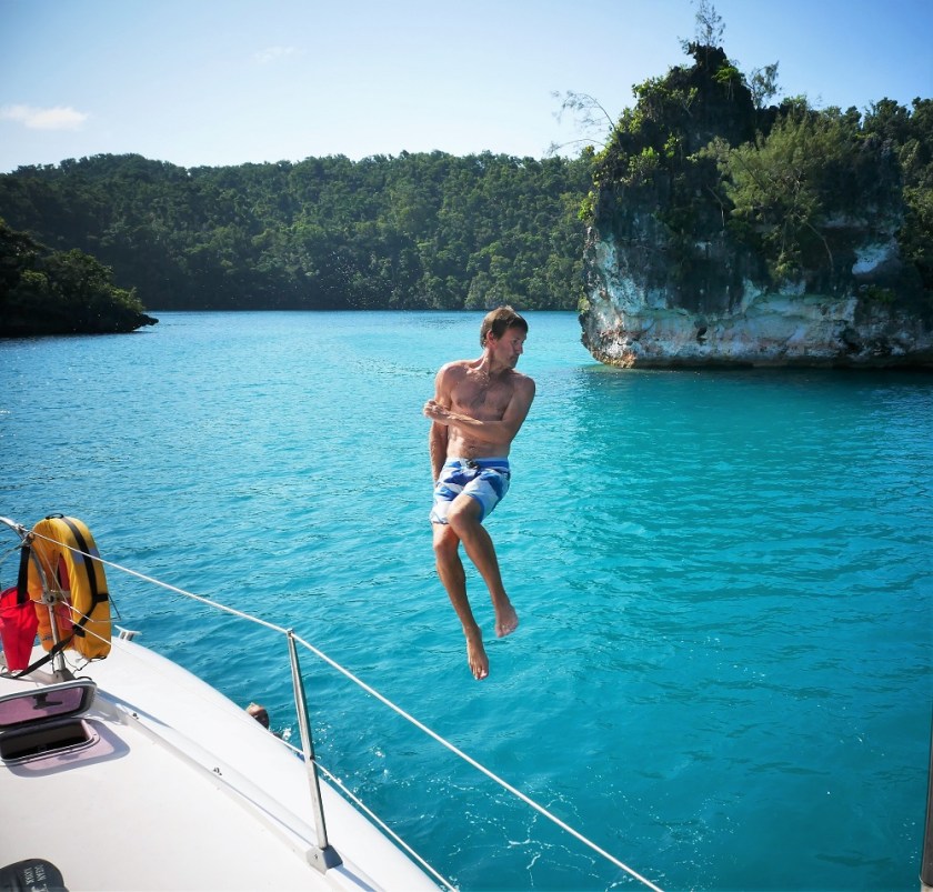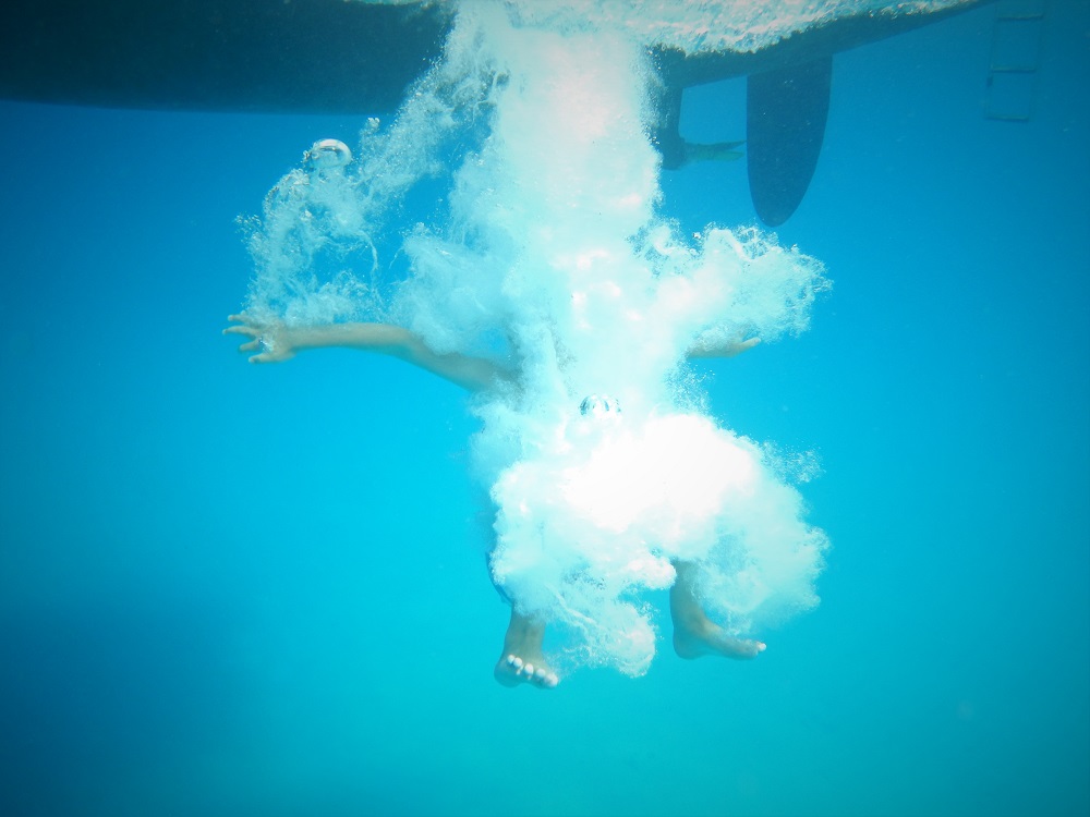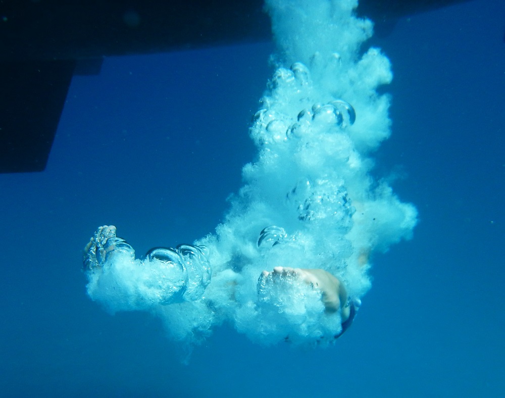 Some of the challenges are: jump in and swim under both hulls, see how far down you can go and who does the biggest bombs. We are all trying to achieve the Triple Yoda.