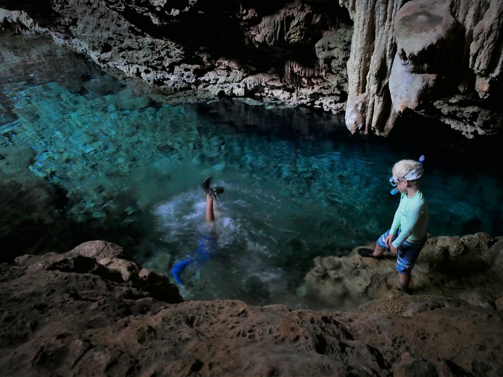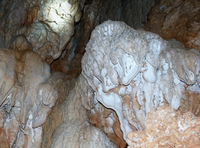 On our last afternoon, at Bertini’s urging, we visit the crystal caves, a large inland underground system which is flooded with saltwater. The cave ceiling is made entirely of crystals spilling down in lumpy bouquets like the heavy petals of a succulent flower. When you shine a torch on them they sparkle and glitter, a brilliantly shiny contoured ceiling made from crystal chandeliers. The crystals extend underwater, and the cave looks like it goes on forever, stretching darkly under water in the direction of the sea.