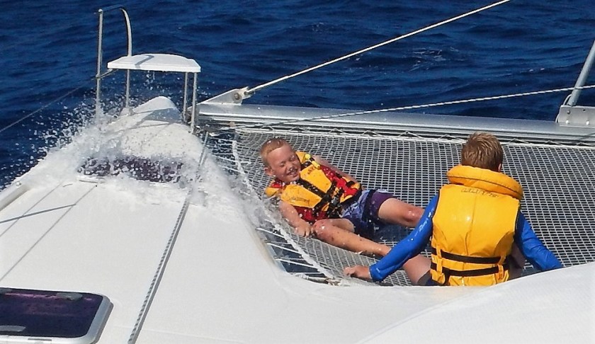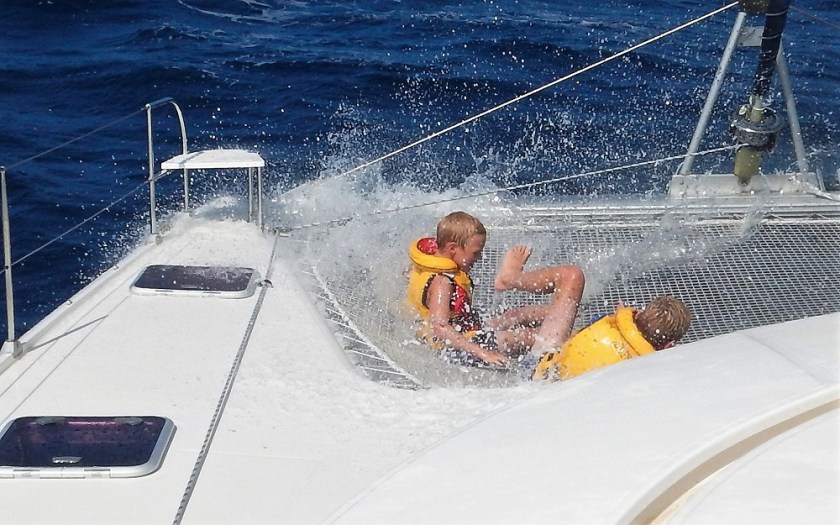 On passage, Lukie and I spend hours on the tramp. We sit down and wait for big waves to come washing over us. We put on life jackets and run, holding on to things like the railing and the floor, to the wave zone (the tramp).