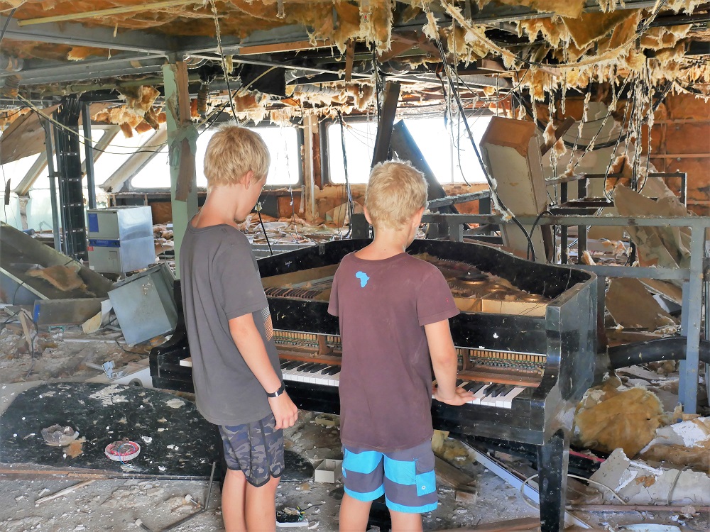 The rusty wreck as seen from the beach.Dilapidated piano left in the ferry.
