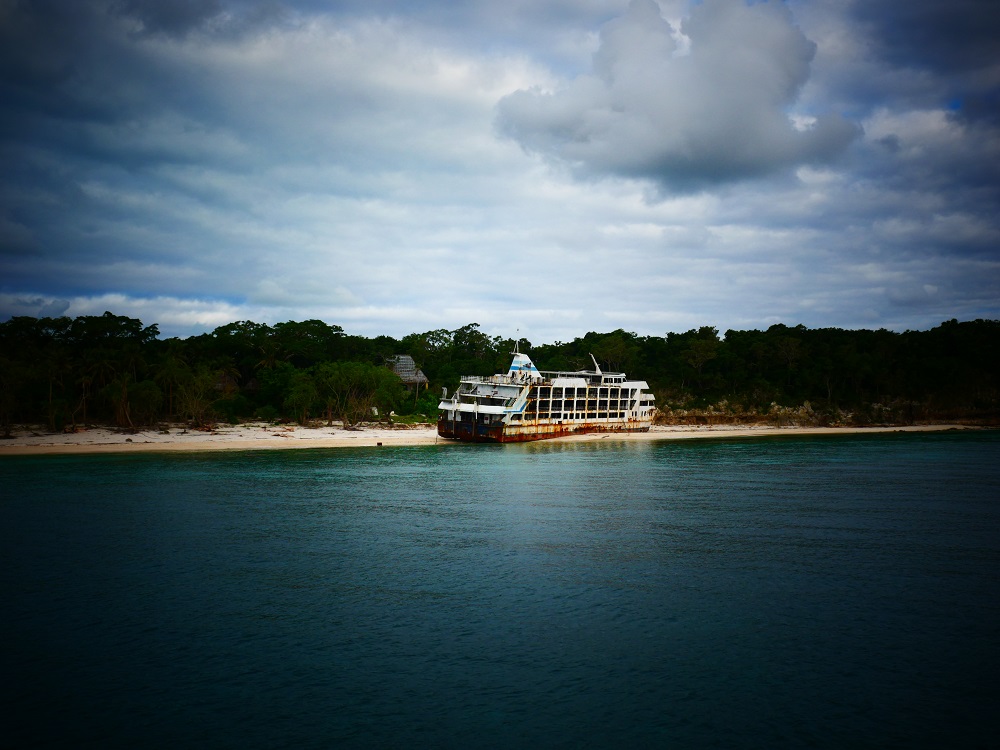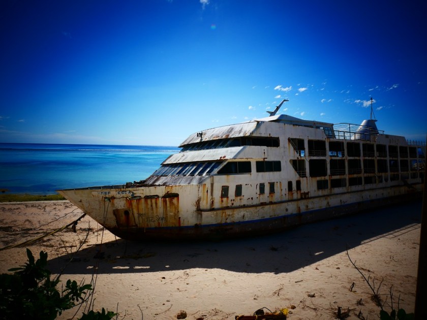 The cave is not far from where we are anchored alongside a beautiful white beach on the western side of Vatulele island. Flanking the beach is an abandoned resort, complete with 19 bure (Fijian-style huts used in tourist accommodation), a white clifftop mansion, and several unfinished buildings on the foreshore. And a huge ferry wreck, a rusty death trap measuring 60 metres in length, which is parked on the sand at the southern end of the beach, just in front of the resort’s pink honeymoon suite.