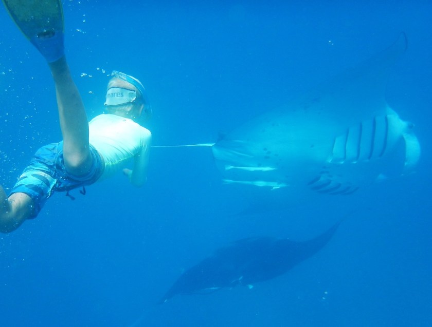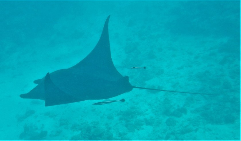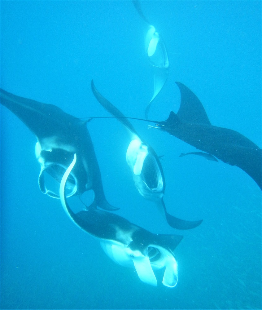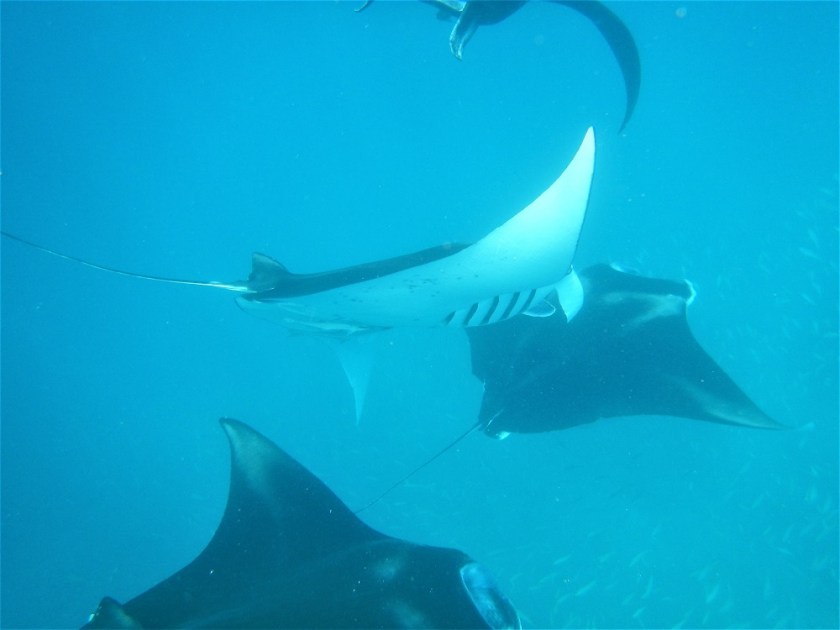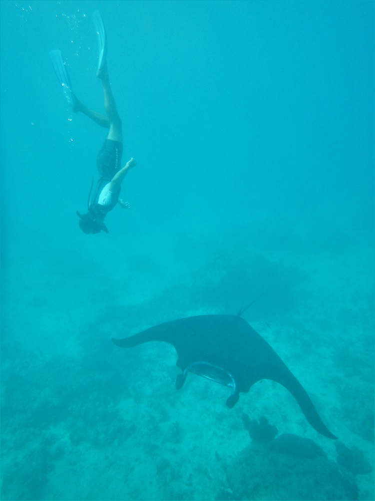 The water between the islands just north of One Island teem with manta rays. The sea there is like manta soup, and everywhere we go we see them, huge black diamonds hanging just below the water surface, waving their fin tips out the water as if to warn us they are there.