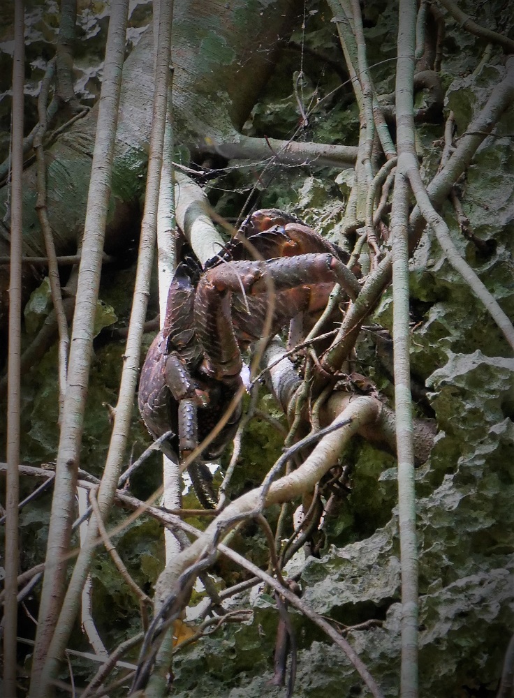 Large coconut crab crawling up tree roots hanging off the cliff.