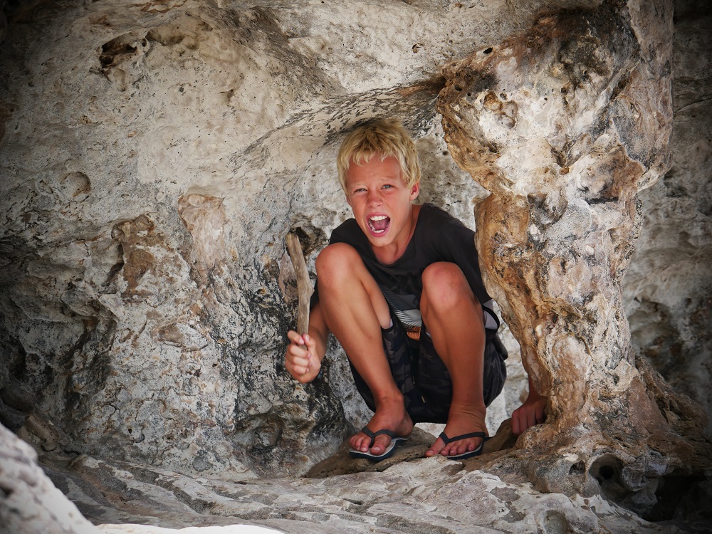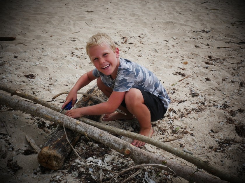 It’s all part of the continued Lord of the Rings games. As they’re reading their way through the books it permeates everything we do, and presently they are deeply immersed in a game where the Elf Thamior (aka Lukas) and the Dwarf Thorin (Matias) find themselves in enemy territory, on a deserted beach backed by palm trees and steep bush-covered hills. Faced with such obstacles the two make plans to survive, collecting seashells, nuts, seeds and pieces of wood, all of which represents edible substances that will help them live through the night and face another day. Monsters lurk behind every corner, and as nightfall nears the two plan for a safe survival of the night, strategically storing their food, and identifying nearby cave-like shelters that might provide refuge should it rain.
