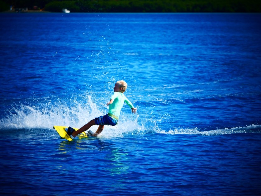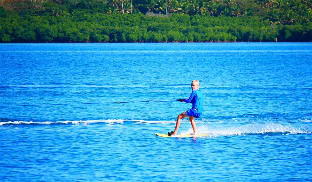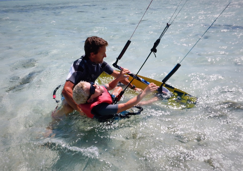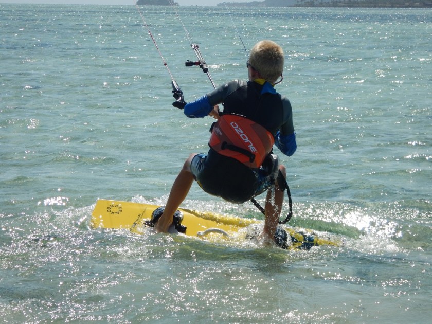 Lukie is about to get up, he is getting the feel for the board. We do this kite surfing on a sandspit in Musket Cove. The sandspit is perfect for starters and getting up on the board.