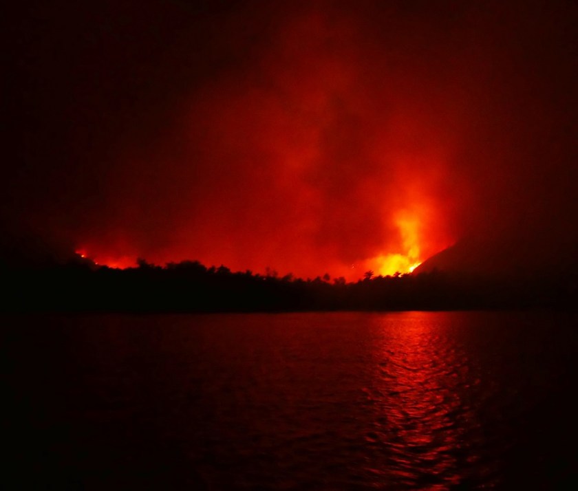 It is not until after the kids have gone to bed that we notice that the fire hasn’t gone out. It is now completely dark, and it is clear that the fire has spread: from the isolated spot behind the near-beach vegetation where David saw it, it has now conquered half the hillside. It is definitely out of control – the flames are licking up trees and as we watch it spreads rapidly, the red glow above the yellow flames lighting up the sky, the inferno reflected in the still water below. We can hear the roar and crackle as hundreds of trees combust, and the smoke is billowing over the boat as it moves out through the calm bay through the still night.
