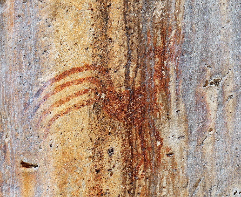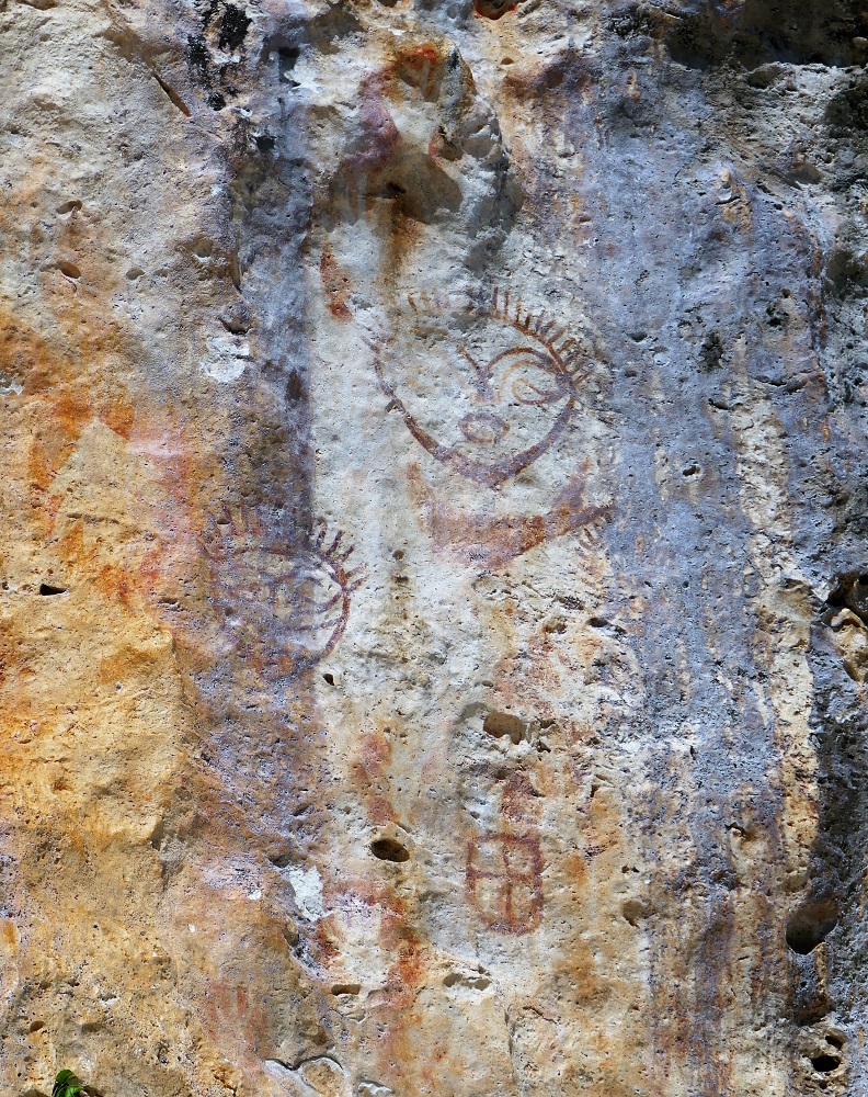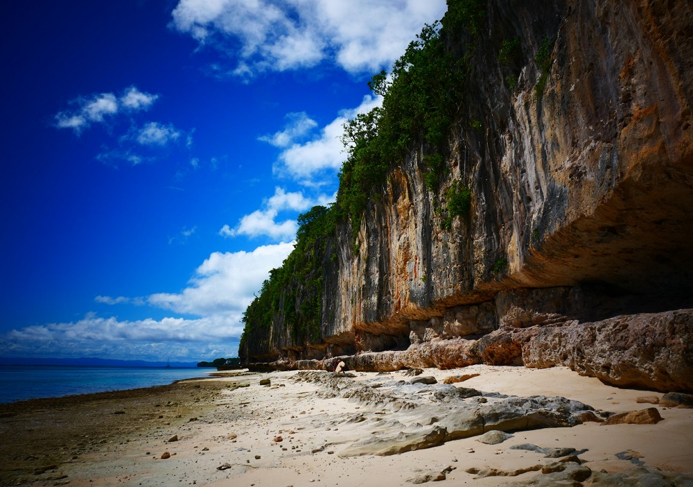 The rock paintings sit high on the steep cliffside. They depict chickens with long finger-drawn tails, handprints and round sun-like faces, immobile images looking out over the calm lagoon, providing a rare window into a past culture that left no written records. The paintings are faint in places, faded by the sun and rain, and I wonder how many have already faded out of existence, and how long the remainder will last in this exposed location. In one place, a large piece of rock has been cut out; apparently, a beautiful octopus used to be there, but someone removed it out to keep for themselves. The cliff face used to be behind a stand of trees, but Cyclone Kenny smashed the vegetation and now they are open to the elements.