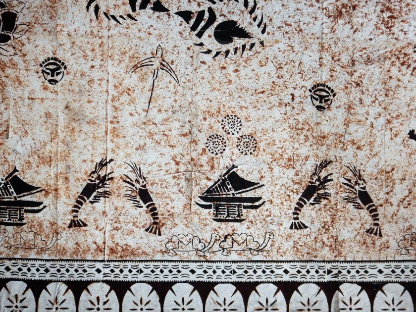 Detail from tapa cloth, showing the sacred prawns, tropicbirds, and ancient rock paintings of round faces.