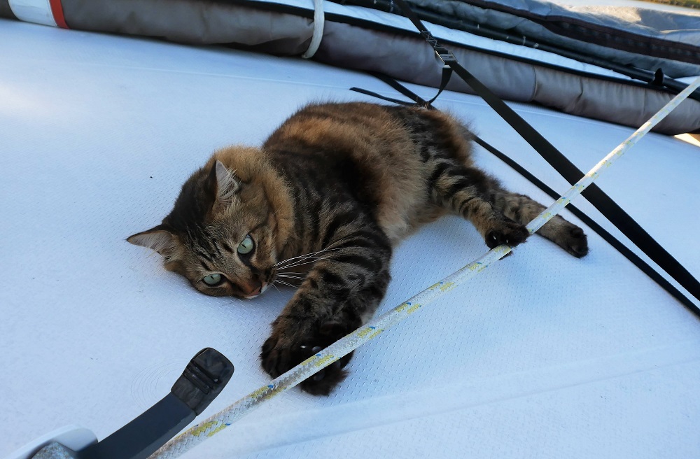 Over the next few days the swell rose and the entrance to the bay closed up, the huge waves crashing over the shallow bar reminding me of our hometown of Raglan where, at times, it is impossible to get a boat in or out of the estuary. When the violent rocking of the boat proved too much for even Paco the boat cat (who, given the constant exaggerated motion of the boat, seemed convinced that we were still on passage and spent his days curled up in a small ball asleep in a corner of the saloon seat) we moved to a spot closer to the headland where the swell was marginally smaller but still probably the worst I have ever experienced on anchorage. Trapped between seaweed farms and huge breaking waves we spent our days enjoying the wild elements. David and the kids found a small wave in the lee of the shore and spent the mornings surfing beautiful peeling waves, and in the afternoons we kite surfed in 20 knots of steady breeze, with Lukie just managing to hold onto a 4 m kite.