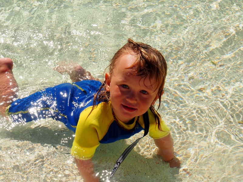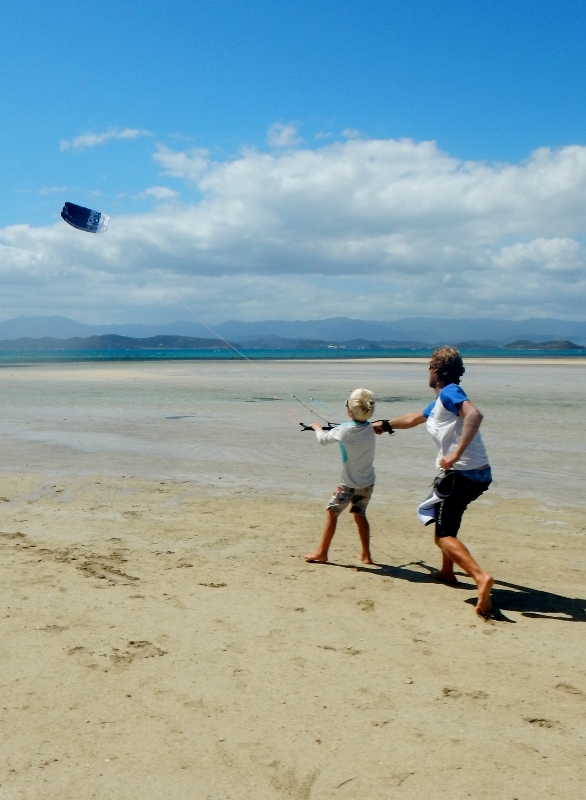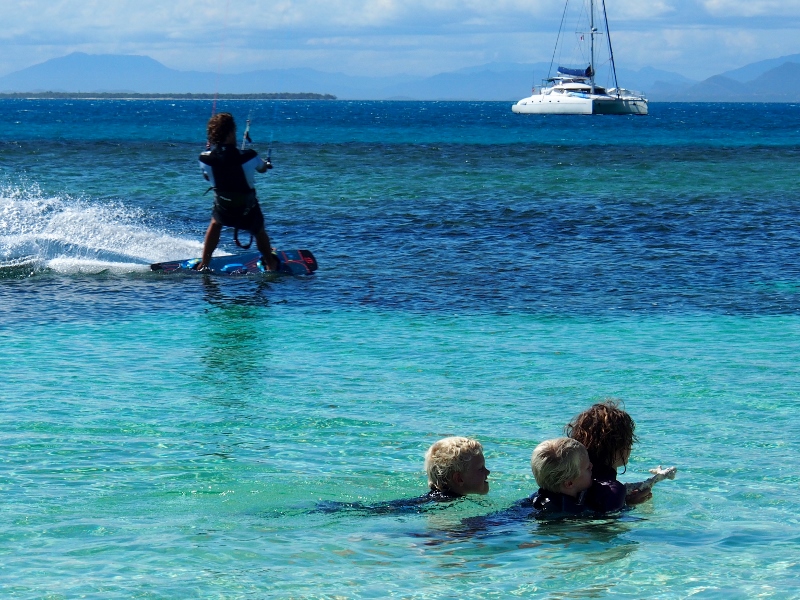Once the wind died down a bit, we went back towards Noumea and stopped at Ilot Koue for a last day of kitesurfing. A tiny stretch of creamy sand scattered with white bleached corals and clinging succulent vegetation fighting to hold down the sand, Koue has only a few trees scattered on the raised platform of the centre of the island, and is surrounded by a turquoise lagoon fringed by a reef teeming with life, topped with a stretch of beautifully flat water to kite in a fresh seabreeze. The sun was fierce and the kids were splashing in the water as we took turns speeding across the shallows on our kite boards, just inches away from where the kids were peacefully playing in the shallows. At the end of a day there in the hot sun we were all red-faced and roasted, finally feeling warm after a week of chilly but enjoyable winds.