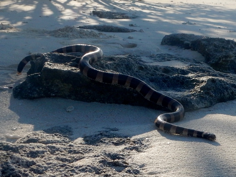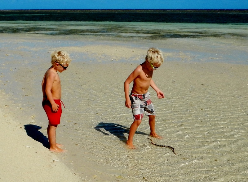 Seasnake venom is the most toxic venom known and one bite from a seasnake can easily kill a grown person. However, the snakes are quite small, and their mouth can’t gape over much, so in reality the risk of getting bitten by one is rather low, although we did have to issue stern warnings to the kids to leave them alone.