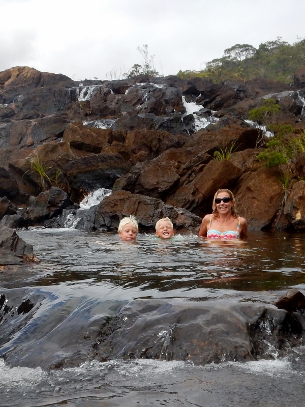 Relaxing in a natural infinity pool, just below a waterfall, Bay of Prony