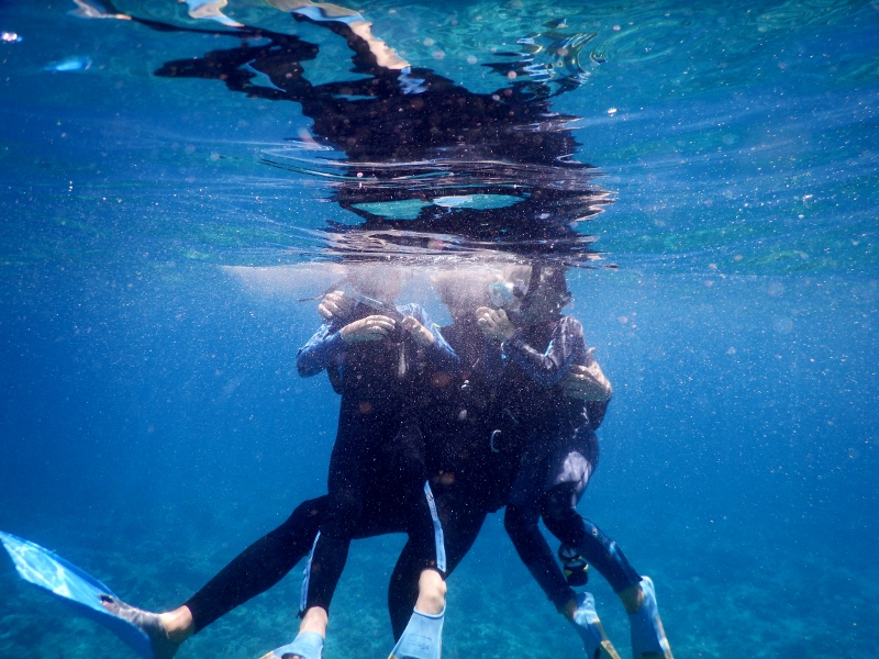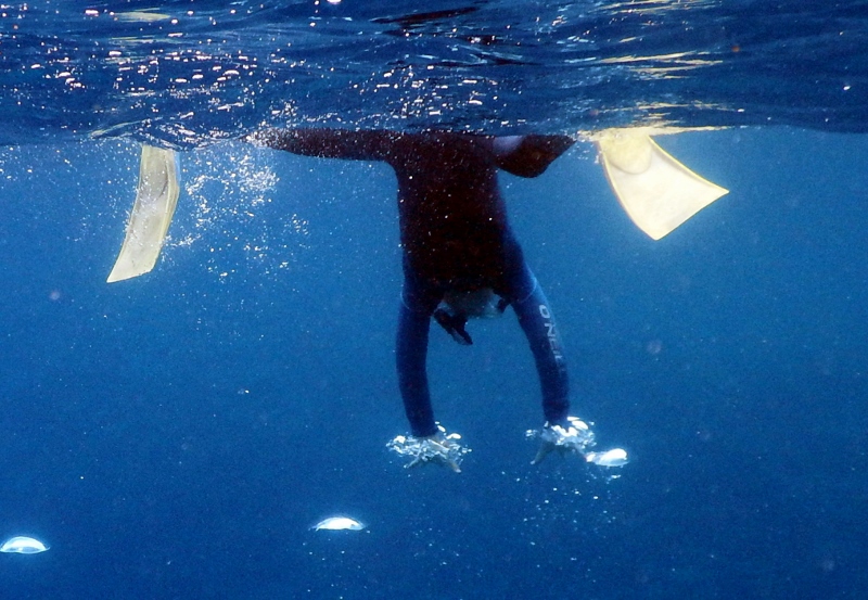On our last day, a hot windless hazy morning, we went to Ilot Nge to show Vida the incredible sealife there. As we approached the mooring buoys through the glassy waters of the early morning we saw turtles and sharks, huge remora, giant trevally and large coral trouts gliding through the crystal clear waters. We soon went snorkelling, and Vida was ecstatic to see a turtle, snorkelling above it as it glid gracefully through the water just above the seabottom for hundreds of metres, weaving in and out of seagrass groves, stopping to visit small coral outcrops on its way away from the shadows following it around on the surface.