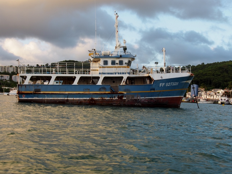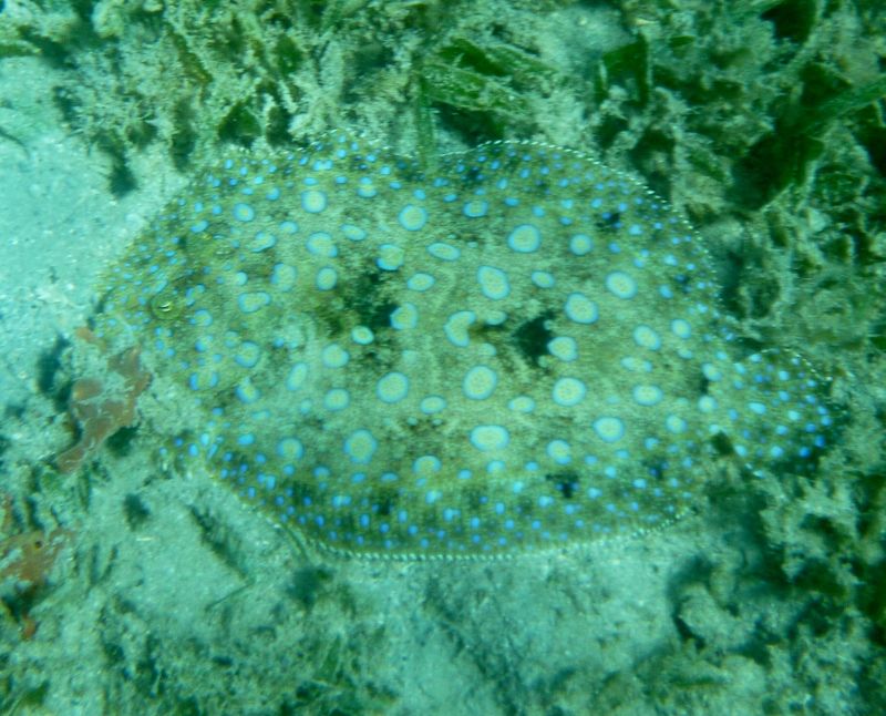 There is great snorkelling just by the boat – seagrass bed, with pipefish, strange eels, and an octopus changing colour as it tries to outswim us – white over the sand, green stripes over the seagrass bed, a thick cloud of ink coupled with a darker shade in a last ditch attempt to deter us. A long nosed pipefish does the same, and we follow it for a great distance, watching it change its hue to blend in with the bottom. A graceful stingray glides by, and we spot a lumpy searobin, curiously ugly, walking along the bottom on its little legs. When we dive down it cowers and fans out a beautiful set of wing like fins, edged with iridescent blue, to try to frighten us off.